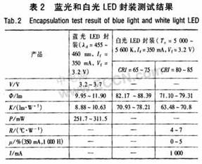 根據(jù)LED的光學(xué)結(jié)構(gòu)及芯片、封裝材料的性能,建立了光學(xué)設(shè)計模型和軟件仿真手段,優(yōu)化了封裝的光學(xué)結(jié)構(gòu)設(shè)計。通過封裝工藝技術(shù)改進(jìn),減少了光的全反射,提高了產(chǎn)品的取光效率。改進(jìn)導(dǎo)電膠的點膠工藝方式,并對裝片設(shè)備工裝結(jié)構(gòu)與精度進(jìn)行了改進(jìn),采用電熱隔離封裝結(jié)構(gòu)和優(yōu)化的熱沉設(shè)計,降低了器件熱阻,提高了產(chǎn)品散熱性能。采用等離子清洗工藝,改善了LED封裝界面結(jié)合及可靠性。針對照明應(yīng)用對光源的光色特性的不同要求,研究暖白、日光白、冷白光LED顏色的影響因素:芯片參數(shù)、熒光粉性能、配方、用量,并通過改進(jìn)熒光膠涂覆工藝,提高了功率LED光色參數(shù)的控制能力,生產(chǎn)出與照明色域規(guī)范對檔的產(chǎn)品。藍(lán)光和白光LED封裝測試結(jié)果見表2。表中:φ為光通量;K為光效;P為光功率;R為熱阻;μ為光衰;I為飽和電流。