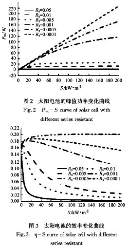由前面太陽(yáng)電池的等效電路可以看出,串聯(lián)內(nèi)阻會(huì)降低短路電流,降低負(fù)載兩端的電壓,引起電池轉(zhuǎn)換效率的下降。圖2和圖3分別為不同串聯(lián)內(nèi)阻的太陽(yáng)電池峰值功率和轉(zhuǎn)換效率隨光強(qiáng)的變化規(guī)律。從圖中可以看出,隨著光強(qiáng)的增加,串聯(lián)電阻的影響越來(lái)越顯著,串聯(lián)內(nèi)阻越高,隨著光強(qiáng)的升高,其轉(zhuǎn)換效率下降的越快。