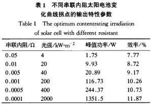 1)在特定的串聯(lián)內(nèi)阻下,太陽(yáng)電他的峰值功率首先隨光強(qiáng)的升高而直線升高,升高到一定程度后曲線曲線變得平緩。曲線的拐點(diǎn)隨串聯(lián)內(nèi)阻的降低而升高。一般常規(guī)電池只能工作在幾個(gè)到20個(gè)太陽(yáng)之間,能夠得到較好的收益。若想進(jìn)一步提高光強(qiáng),必須采用小串聯(lián)內(nèi)阻的太陽(yáng)電池。