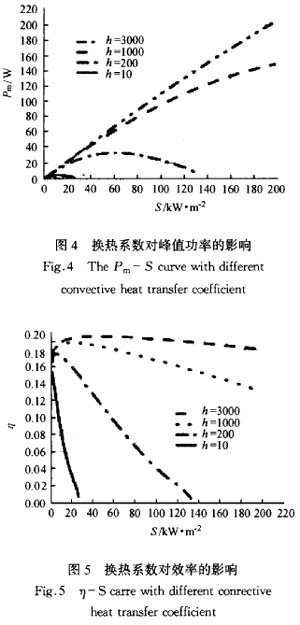 2)換熱系數(shù)越高,系統(tǒng)的性能越好,而且隨著光強(qiáng)的升高,換熱系數(shù)的影響越來(lái)越顯著。采用空氣自然對(duì)流的聚光光伏發(fā)電系統(tǒng),最多可以工作在29一134個(gè)太陽(yáng)下。