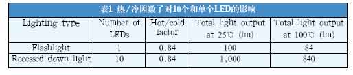 乍一看,16%的LED光通減少量影響可能不大。然而,當(dāng)考慮到一個照明裝置由多個LED組成時,這個問題就嚴(yán)重了。用10個LED組成的嵌筒燈同一個LED組成的手電筒比較,熱/冷因數(shù)的影響就顯現(xiàn)出來了。
