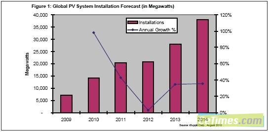 預(yù)計(jì)今年全球光伏裝機(jī)容量將增長(zhǎng)到14.2GW,比2009年的7.2GW大增97.2%,而且也沒(méi)有明年降溫的跡象。圖1所示為2009-2014年全球光伏裝機(jī)容量預(yù)測(cè),2014年新增光伏系統(tǒng)預(yù)計(jì)將達(dá)到38.1GW。
