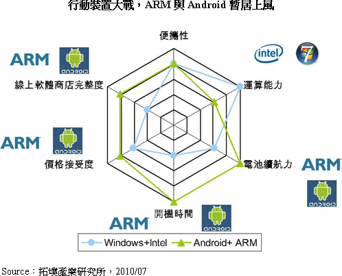今年在智慧型手機(jī)作業(yè)系統(tǒng)及處理器都沒有發(fā)表新版本的情形下,2010年第二季智慧型手機(jī)較去年同期成長了43%,采用ARM處理器與Apple作業(yè)系統(tǒng)的iPad以每月出貨100萬臺(tái)的速度快速成長。而搭載Intel Capella新平臺(tái)及Windows 7的NB出貨量雖然也表現(xiàn)不惡,但第二季的年成長率只有32%,兩者潛力高下立判。