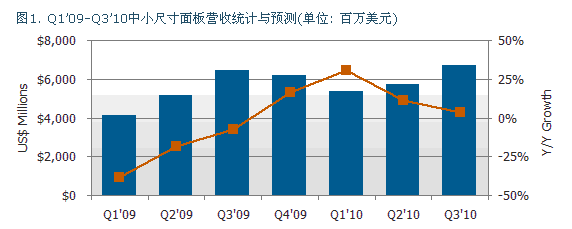 全球中小尺寸面板的出貨在2010年第二季持續(xù)攀升,營(yíng)收數(shù)字達(dá)到五十四億美元,比去年同期成長(zhǎng)百分之三十一。根據(jù)最新的Quarterly Small/Medium Shipment and Forecast Report指出, 這個(gè)市場(chǎng)區(qū)隔預(yù)計(jì)持續(xù)成長(zhǎng),而在2010年第三季的全球營(yíng)收數(shù)字將會(huì)達(dá)到六十七億美元。