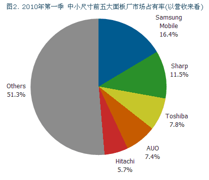 Samsung Mobile Displays 不論在出貨量和營(yíng)收上都維持穩(wěn)定地位,分別在全球市場(chǎng)擁有11.8%和16.84的市場(chǎng)占有率,同時(shí)在手機(jī)所需的TFTLCD和AOMLED面板上都有很高的出貨量。Sharp的營(yíng)收在2010年第二季呈現(xiàn)大幅下滑,這是因?yàn)橄噍^于競(jìng)爭(zhēng)對(duì)手而言,市場(chǎng)上對(duì)于可攜式游戲機(jī)等裝置的需求下跌所致。 Toshiba的營(yíng)收沒有像競(jìng)爭(zhēng)對(duì)手下滑這么多,這是因?yàn)楦叻直媛适謾C(jī)和汽車用顯示器的需求增加所致。