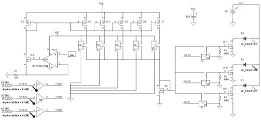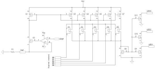 為了在LED中實現(xiàn)精確及穩(wěn)定的正向偏置條件,通過與帶隙參考提供的恒定電壓相關(guān)的外部電阻產(chǎn)生一個參考電流。與運算放大器U1相關(guān)的晶體管Q1在Vref引腳產(chǎn)生恒定輸出電壓。Vref和地之間連接的外部電阻產(chǎn)生流經(jīng)Q1和Q2的恒定電流。這個電流這時候就被Q3~Q7的晶體管系列建立鏡像和放大,每個電流被連接至開關(guān)S1~S5,并且被晶體管Q8相加。最后,晶體管Q9復(fù)制參考電流至LED1。這種結(jié)構(gòu)針對每個LED進行復(fù)制,而芯片的布局經(jīng)仔細分析,以優(yōu)化每個LED之間的匹配。