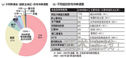圖日本廠商在開(kāi)發(fā)方面領(lǐng)先圖為Cintelliq公司就以實(shí)現(xiàn)有機(jī)EL照明為目的的專(zhuān)利申請(qǐng)數(shù)所做調(diào)查的結(jié)果。按申請(qǐng)地劃分,日本為56%,大大超出排在第2位的美國(guó),遙遙領(lǐng)先(a)。在本圖中,1994~2006年的專(zhuān)利申請(qǐng)數(shù)通過(guò)2003年以后的文獻(xiàn)調(diào)查得到。按不同組織劃分,柯尼卡美能達(dá)集團(tuán)為176件,排在第1位(b)。大約3/4的專(zhuān)利與藍(lán)色磷光材料有關(guān)。(b)為2003~2007年有機(jī)EL照明(包括背照燈)專(zhuān)利按組織劃分的申請(qǐng)數(shù)(前10家公司)及主要領(lǐng)域。由于按組織劃分的日本專(zhuān)利申請(qǐng)數(shù)數(shù)據(jù)中不包含2007年第2季度以后的數(shù)據(jù),因此,實(shí)際上日本企業(yè)的申請(qǐng)數(shù)有可能更多。