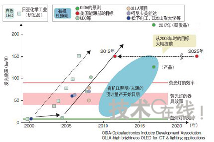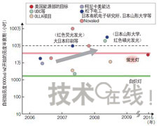 政府機(jī)構(gòu)的資助額大多為3年內(nèi)數(shù)億~30億日元的規(guī)模,德國(guó)“OPAL(OrganicPhosphorescentlightsforApplicationsintheLightingmarket)”項(xiàng)目為5年內(nèi)1億歐元(約合140億日元),遠(yuǎn)遠(yuǎn)多于其他項(xiàng)目。在發(fā)光效率方面迅速追趕白色LED有機(jī)EL照明雖然具有一些獨(dú)特的特點(diǎn),但考慮到實(shí)際影后,還是避免不了在發(fā)光效率、使用壽命、成本等基本性能上與白色LED及現(xiàn)有照明技術(shù)一決高低。近來(lái)有機(jī)EL照明的性能得到了大幅提高。首先是發(fā)光效率。目前,有機(jī)EL照明在研發(fā)水平上比白色LED約落后約2年。2008年6月美國(guó)UniversalDisplay(UDC)發(fā)布的“102lm/W”的發(fā)光效率,與2006年3月日本日亞化學(xué)工業(yè)發(fā)布的白色LED的發(fā)光效率不相上下。山形大學(xué)的城戶表示,“已經(jīng)看到了實(shí)現(xiàn)200lm/W的曙光”)。