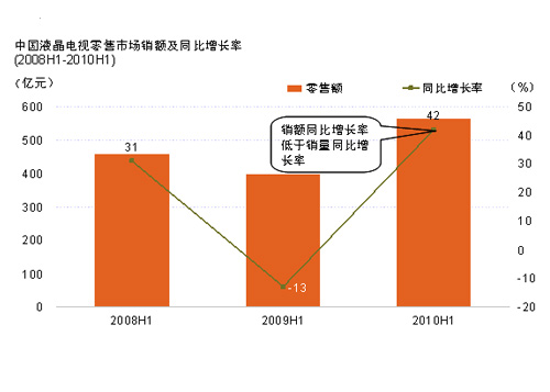 根據(jù)捷孚凱(GfK 中國)全國液晶電視零售推算數(shù)據(jù),2010年上半年液晶電視市場整體規(guī)模為1517萬臺(tái),同比2009年上半年規(guī)模增長55.2%,而銷售額同比增長42%。上半年度整體彩電市場規(guī)模為1863萬臺(tái),液晶電視在整個(gè)彩電市場中的占比已經(jīng)達(dá)到82%。