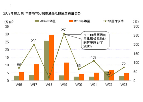 究其原因,其實(shí)與我們之前分析的上半年市場的變革不無關(guān)系。今年五一是LED電視第一次大規(guī)模上市,各廠商都試圖在這場前哨戰(zhàn)中拔得頭籌,均不遺余力地提前進(jìn)行宣傳造勢;而諸如國美、蘇寧等幾家大型連鎖零售商也推波助瀾,比以往更早、更多地投入資源展開宣傳攻勢。事實(shí)證明,媒體攻勢是有效地。顧客提前兩周就已紛紛步入商場,而大量的新店開業(yè)活動(dòng)和老店重裝慶典,加上五一本身就有的節(jié)日促銷活動(dòng),使不少消費(fèi)者放心地在節(jié)前就買單回家享受擁有平板電視的生活。