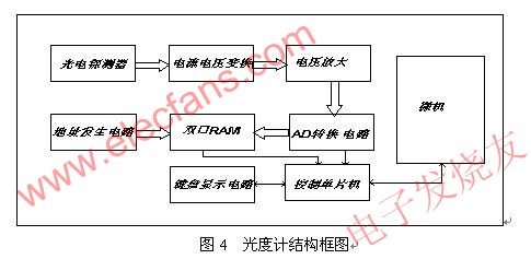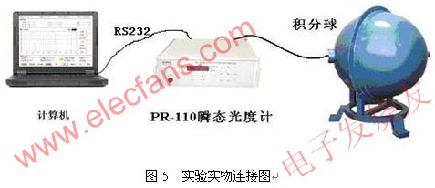 為了精確測量光通量,把光源放在積分球中。經過V(λ)校準的光電探測器接受光信號,其輸出的電信號經過放大轉換電路,將光電探測器輸出的光電流信號轉換成較大的電壓信號,利用AD轉換器進行采樣。由于單片機讀取和存儲數(shù)據(jù)速度較慢,故而采用了雙口RAM和地址發(fā)生電路,使得光度計能夠在采用時自動對數(shù)據(jù)進行存儲。單片機則在所有采樣過程執(zhí)行完畢后,再從雙口RAM內讀取數(shù)據(jù),并發(fā)送給微機顯示處理。系統(tǒng)結構圖和實物連接圖如下。