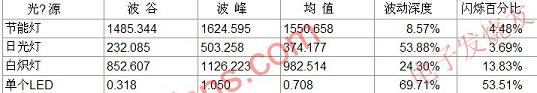 在實驗中,我們利用瞬態(tài)光度計對26W螺旋型電子節(jié)能燈,60W普通直管型日光燈,60W普通白熾燈,單個紅色LED等四種典型的照明光源測量其光通量的變化波形,計算波動深度。在PR110中,我們設定采樣間隔為0.1ms,所有燈都采用50Hz交流電供電,測量結果如表1。