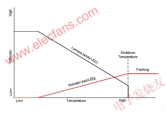 圖2所示系統(tǒng)中的流明下降是通過(guò)低功耗的紅色LED指示的。當(dāng)系統(tǒng)處于最大流明輸出時(shí),紅色LED關(guān)閉;當(dāng)LED燈溫度升高時(shí),流明輸出則會(huì)下降,而流明輸出下降時(shí),紅色LED即會(huì)開(kāi)啟。隨著流明輸出不斷下降,紅色LED的強(qiáng)度會(huì)相應(yīng)增加。當(dāng)流明輸出下降到其最低強(qiáng)度時(shí),紅色LED將會(huì)完全開(kāi)啟。