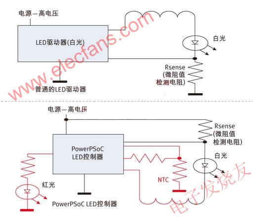 就改進(jìn)操作、提高安全性而言,這兩種監(jiān)控LED燈溫度的方法實(shí)施起來(lái)都很簡(jiǎn)單直接。圖1是使用LED作為升溫源頭的這兩種方法的原理圖。