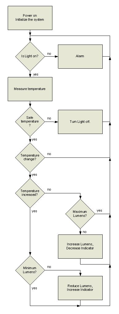 當(dāng)“溫度升高”塊測(cè)出溫度升高,便會(huì)觸發(fā)“最低流明”塊。若流明未達(dá)到預(yù)設(shè)的最低值,則流程導(dǎo)向“降低流明,調(diào)亮指示燈”塊。若流明輸出達(dá)到預(yù)設(shè)的最低值,則重新進(jìn)入“是否開(kāi)燈?”塊,重新開(kāi)始檢測(cè)序列。