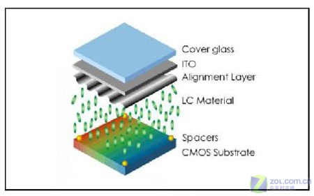 LCOS面板的結構有些類似TFTLCD,一樣是在上下二層基板中間撒布Spacer以加以隔絕后,再填充液晶于基板間形成光閥,藉由電路的開關以推動液晶分子的旋轉,以決定畫面的明與暗。LCOS面板的上基板是ITO導電玻璃,下基板是則矽晶圓CMOS基板,LCOS面板最大的特色在于下基板的材質是單晶矽,因此擁有良好的電子移動率,而且單晶矽可形成較細的線路,因此與現(xiàn)有的HTPSLCD及DLP投影面板相較,LCOS是比較容易達成高解析度的投影技術。
