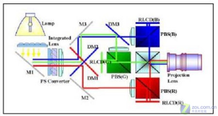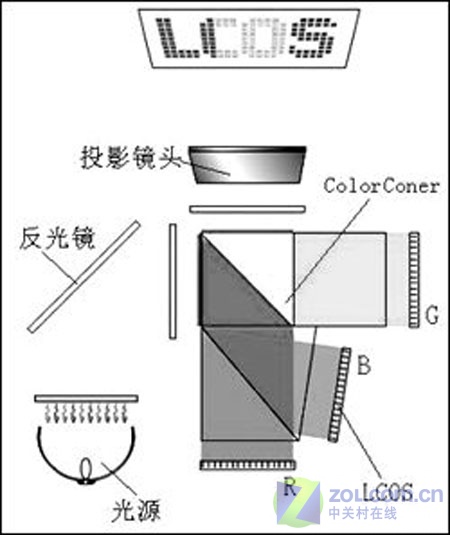 投影機技術基本顯影原理相仿,主要是由鹵素燈、氙氣燈等發(fā)光,集光至面板,將面板的影像經反射或透射投射出影像,再經過分光、合光系統(tǒng),最后將影像投射到屏幕顯像。LCOS(LiquidCrystalonSilicon)是一種全新的數碼成像技術,它采用半導體CMOS集成電路芯片作為反射式LCD的基片,CMOS芯片上涂有薄薄的一層液晶硅,控制電路置于顯示裝置的后面,可以提高透光率,從而實現(xiàn)更大的光輸出和更高的分辨率。