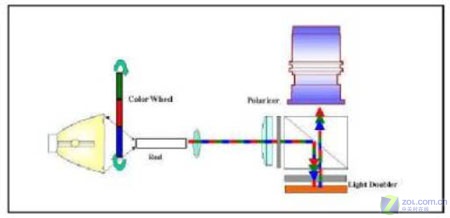 單片式ColorWheel光學引擎則是以快速旋轉的ColorSwitch將白光形成循序的紅、藍、綠光,并將三原色光與驅動程式產生的紅、藍、綠畫面,同步形成分色影像,再藉由人眼視覺暫留的特性,最后在人腦產生彩色的投影畫面。類似的技術有:Displaytech發(fā)表的FieldSequentialColor、Philip所采用的ScrollingColor-RotatingPrism架構、及JVC采用的SpatialColor–Hologram架構。[page]
