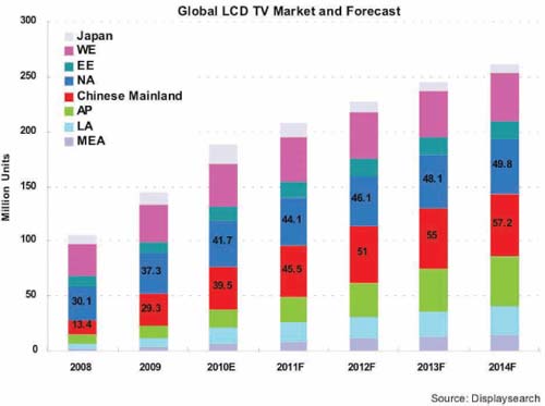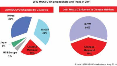 2010年全球MOCVD新增安裝量中,由于受到LED背光在LCD TV滲透的加快帶動下, LCD TV制造強國的韓國增量最多,其次是臺灣地區(qū)。根據(jù)SEMI統(tǒng)計,中國大陸今年MOCVD新增量大概在177臺,出貨量居全球第三。另外,根據(jù)SEMI統(tǒng)計和分析,結(jié)合MOCVD供應(yīng)情況,2011年中國MOCVD新增量份額有望達到全球的40%,而其它地區(qū)的增量會保持與2010年相當?shù)乃交蛳陆怠?