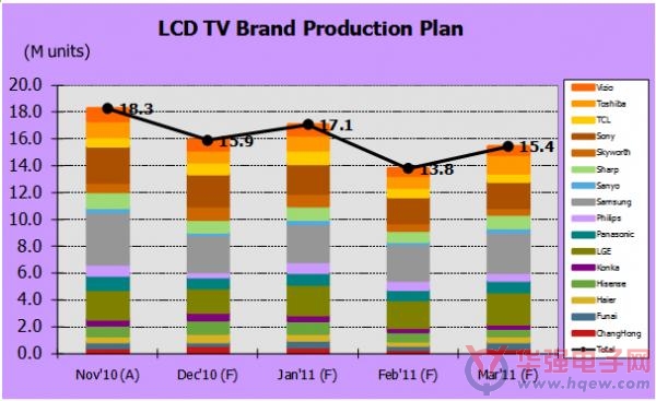 包括全球品牌三星和中國本土品牌康佳在內(nèi)的前16家液晶電視品牌商每月生產(chǎn)總量已從2010年11月份的1千8百30萬臺降到了2011年3月份的1千5百40萬臺(如圖一)。同時,2011年第一季度生產(chǎn)總量預(yù)計為4千6百30萬臺,比2010年第四季度降低了12%。