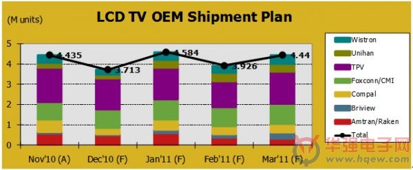DisplaySearch顯示和電視研究總監(jiān)Debroah Yang表示,“許多地區(qū)市場環(huán)境不穩(wěn)定,從而導(dǎo)致電視需求量也不確定。盡管如此,第一季度的產(chǎn)品發(fā)布所預(yù)估的需求前景使一些品牌商增加了1月份的生產(chǎn)投入。”雖然電視品牌商對市場前景持謹(jǐn)慎態(tài)度,液晶電視代工廠商(OEM/ODM)卻在2010年12月份到2011年3月份期間持續(xù)增加每月出貨計劃。這個現(xiàn)象表明電視品牌商正在逐步增加生產(chǎn)外包到OEM/ODM廠商。而這主要是基于成本控管和生產(chǎn)規(guī)模的考慮。此外有些品牌商為了獲取所需的面板供應(yīng)也會增加釋單比率。