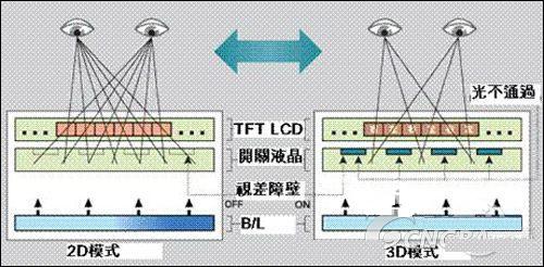 這些條紋寬幾十微米,通過它們的光就形成了垂直的細條柵模式,稱之為“視差障壁”。而該技術正是利用了安置在背光模塊及LCD面板間的視差障壁,在立體顯示模式下,應該由左眼看到的圖像顯示在液晶屏上時,不透明的條紋會遮擋右眼;同理,應該由右眼看到的圖像顯示在液晶屏上時,不透明的條紋會遮擋左眼,通過將左眼和右眼的可視畫面分開,使觀者看到3D影像。