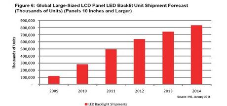 對于筆記本電腦和上網(wǎng)本面板,2011年LED背光的占有率將從2010年的91%上升到100%。2011年LED背光在電視和監(jiān)視器面板中的占有率將從2010年的20%左右上升到接近50%的水平。