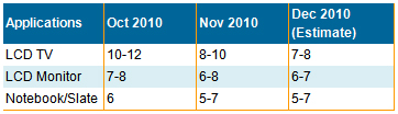在美國,2010年第四季度零售市場銷售活躍,CCFL背光機種為主要熱銷產(chǎn)品,但該市場并未緩減所有品牌商的庫存壓力。大部分品牌商都仍面臨著LED背光液晶電視模塊居高不下的庫存問題。因此我們估計在2011年第一季度,品牌商將會趕在3月份新模塊上線前,加大促銷力度重點投放LED背光液晶電視。在中國,截止12月末,假期期間良好的銷售有效地減緩了庫存壓力,我們估計液晶電視庫存將在12月底降低到中等水平。