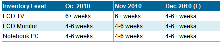 盡管11月份之前液晶顯示器庫存量處于中等水平,但主要液晶顯示品牌商重點投放的中國市場卻銷售緩慢,從而導(dǎo)致了2010年年底庫存量上升。