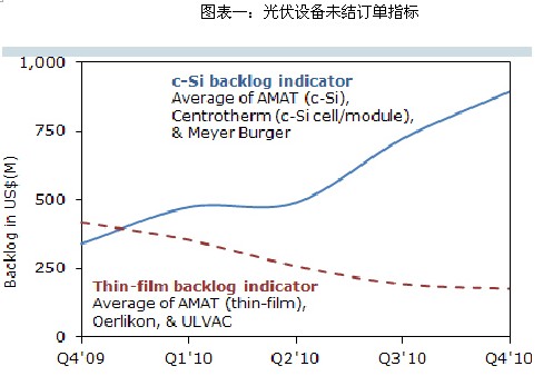 隨著2011年所公布的超越60%年度增長率的產能的擴張,首選設備供應商的訂單使得未結訂單總量創(chuàng)下新記錄,超過了2008年由高價格交鑰匙薄膜生產線業(yè)務推動的水平。2010年第四季度末,有20家設備供應商的訂單積累已經超過了1億美金,這些訂單主要的出貨時間集中在2011年上半年。目前的未結訂單總量與2009年第四季度相比有26%的增長,導致2010年的訂單出貨比原高于上一年水平(1.24),其中2010年第二季度的更是創(chuàng)下了1.7的八季高點。