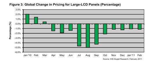 據(jù)IHS iSuppli公司的研究,由于需求疲軟和庫(kù)存上升,2月份大型液晶顯示器(LCD)面板價(jià)格繼續(xù)下降,但到4月份這種情況可能會(huì)有所改善,因?qū)脮r(shí)品牌廠商會(huì)增加購(gòu)買電視面板。