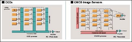 而現(xiàn)在普遍使用的兩種圖像傳感器就是大家經(jīng)常聽說到的CMOS和CCD傳感器了,為了讓大家最終更好地認(rèn)識背照式CMOS傳感器,小編在此也簡單說一下兩種傳感器的異同以及優(yōu)缺點。如下圖所示,左邊為CCD傳感器的結(jié)構(gòu),右邊的為CMOS傳感器的機構(gòu),黃色的小方塊為像素點。由圖示可以看出,CCD傳感器中每一行中每一個象素的電荷數(shù)據(jù)都會依次傳送到下一個象素中,由最底端部分輸出,再經(jīng)由傳感器邊緣的放大器進(jìn)行放大輸出;而在CMOS傳感器中,每個象素都會鄰接一個放大器及A/D轉(zhuǎn)換電路,用類似內(nèi)存電路的方式將數(shù)據(jù)輸出。簡單說就是對待單個像素點上得到的電荷數(shù)據(jù)有不同方法,CCD是全部傳輸出來再統(tǒng)一處理,CMOS是先分別處理在傳出來。這兩種方式并不是人們憑空想象出來的,而是由CCD和CMOS的制作工藝決定的,因為CMOS器件內(nèi)傳輸數(shù)據(jù)會有較高的失真,所以需要先做處理。