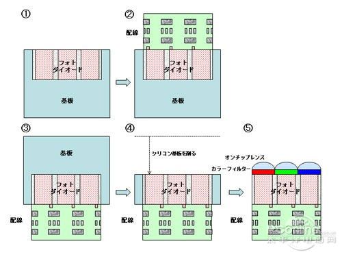 背照式CMOS傳感器的具體結(jié)構(gòu)如上圖所示(源自索尼資料,其他芯片廠家的產(chǎn)品可能在細(xì)節(jié)上有不同,但大體意思是相同的),橙色的為光線路,黃色線為受光面。左邊的傳統(tǒng)式,明顯看到光線通過微透鏡后還需要經(jīng)過電路層才能到達(dá)受光面,中途光線必然會遭到部分損失(包括被阻擋或被減弱)。背照式CMOS傳感器的元件則不同,在改變了結(jié)構(gòu)后,光線通過微透鏡后就可以直接到達(dá)感光層的背面,完成光電反應(yīng),從進(jìn)光量上改善了感光過程。[page]