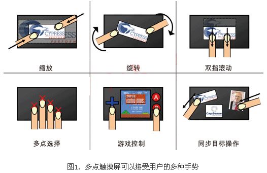 用投射式觸摸屏實現(xiàn)的幾種常見的多點觸摸手勢包括手指的張合、縮放、雙指的滑動和旋轉。它們可以快速方便地處理數(shù)據(jù)、內(nèi)容和用戶參數(shù)。便攜游戲和文本/電子郵件應用也可以利用多點觸摸技術。在一個多指觸摸過程中,多觸點APA(全點可尋址)模式可以精確地測定每個手指所按壓的坐標位置。