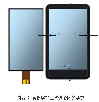 對尺寸小于4英寸(10厘米)的觸摸屏,觸摸屏的邊沿寬度,在觸摸傳感器尾線一側應不窄于10mm,與尾線側毗鄰的兩側應不窄于3mm。這個邊沿空間用于隱藏把透明的ITO圖案鏈接到控制電路的非透明銀質(zhì)箔線并隱藏控制電路本身。對于使用玻璃基底的觸摸屏,邊沿的寬度或許可以做得更窄,但仍建議使用上述指導原則。圖2 描述了這些指導原則。
