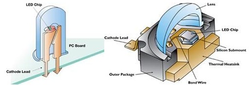 傳統(tǒng)炮彈型封裝,以插件式運用,廣泛運在家電或是通訊產品的指示燈,??吹降念伾酁榧t、黃、綠色光等,但因為大部分LED產生的熱只能藉由2根導線,往組裝的基板上導熱,散熱效果不佳。