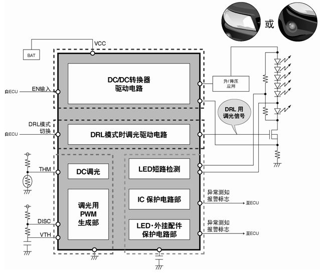 最近,汽車用前照燈正在逐漸推進(jìn)LED化,以高效、長(zhǎng)壽這一優(yōu)點(diǎn)為背景,未來(lái)有望成為前照燈市場(chǎng)的重心。此外為確保車輛安全、可見(jiàn)度,安裝使用LED前照燈的事例會(huì)不斷增加,而未來(lái)預(yù)計(jì)LED前照燈/DRL的搭載也將面向車載用途形成標(biāo)準(zhǔn)規(guī)格系列。目前,LED前照燈只限于高級(jí)豪華車等一部分的車型上選用,對(duì)汽車制造商、前照燈制造商來(lái)說(shuō),多采用延用通用的LED驅(qū)動(dòng)IC,或以分立元器件為主構(gòu)成的形式,如果裝載DRL就需要另外配備與其相配的驅(qū)動(dòng)電路。羅姆針對(duì)未來(lái)前照燈的LED化,率先著手開(kāi)發(fā)了一款專用的IC,并推動(dòng)獲得前照燈用LED驅(qū)動(dòng)器所需功能的專用IC的開(kāi)發(fā)。此次羅姆新開(kāi)發(fā)的這種前照燈專用LED驅(qū)動(dòng)IC,特別面向歐美等國(guó)先行開(kāi)始普及的DRL,通過(guò)內(nèi)置振蕩器電路實(shí)現(xiàn)微處理器控制的PWM調(diào)光。另外,為對(duì)應(yīng)要求高可靠性的車載市場(chǎng)需求,在搭載能監(jiān)測(cè)LED短路、LED開(kāi)路等前照燈故障的各種保護(hù)功能,與分裝器件構(gòu)成時(shí)或與通用的LED驅(qū)動(dòng)IC組成時(shí)的情況相比,通過(guò)削減部件數(shù)量從而實(shí)現(xiàn)了可靠性的大幅提高。另外,絕對(duì)最大電壓設(shè)定為50V,對(duì)于鋰離子電池電壓波動(dòng)也能非常輕松地承受的高耐壓化也得以實(shí)現(xiàn)。