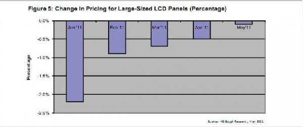 上圖所示為IHS iSuppli公司對1-5月大尺寸LCD面板價格變動的逐月預(yù)測。大尺寸LCD面板是指對角尺寸從10.1到55英寸以上的面板。