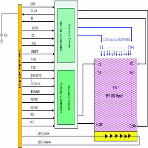 從TFT-LCD的切面結(jié)構(gòu)圖(圖1)可以看到LCD是由二層玻璃基板夾住液晶組成的,形成一個(gè)平行板電容器,通過(guò)嵌入在下玻璃基板上的TFT對(duì)這個(gè)電容器和內(nèi)置的存儲(chǔ)電容充電,維持每幅圖像所需要的電壓直到下一幅畫(huà)面更新。液晶的彩色都是透明的必須給LCD襯以白色的背光板上才能將五顏六色表達(dá)出來(lái),而要使白色的背光板有反射就需要在四周加上白色燈光。因此在TFT-LCD的底部都組合了燈具,如CCFL或LED。