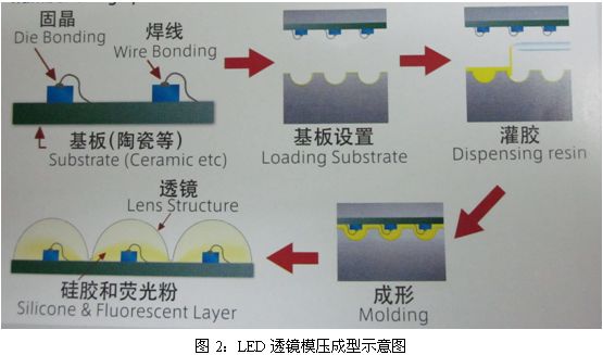 在近日舉行的第17屆廣州國(guó)際照明展覽會(huì)上,TOWA株式會(huì)社東和半導(dǎo)體設(shè)備(上海)有限公司董事總經(jīng)理鈕方舜向電子元件技術(shù)網(wǎng)記者詳細(xì)介紹了壓縮成型工藝。鈕方舜介紹說(shuō),不同于傳統(tǒng)的點(diǎn)膠,壓縮成型工藝是首先向透鏡模具型腔內(nèi)注入必要量的液態(tài)硅膠后,然后將貼裝了LED芯片的基板與透鏡模具型腔貼合在一起,基板上的每個(gè)LED芯片準(zhǔn)確的浸入模具型腔內(nèi),成型后分離基板和透鏡模具,基板上的每個(gè)LED芯片都已經(jīng)封裝好了透鏡。