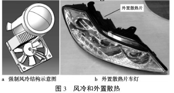 (2)強制對流提供與外界空氣熱交換。在散熱片的背面加裝風(fēng)扇促使強制空氣流動。風(fēng)扇加速了散熱片的熱交換的同時,流動的空氣也直接從PCB板上帶走了部分熱量。由于燈體的狹小且密封,與外界的空氣對流幾乎不可能。圖3a所示風(fēng)冷結(jié)構(gòu)中風(fēng)扇的強制對流可以緩解散熱器中心區(qū)域與周圍環(huán)境的溫度不均勻,使燈體內(nèi)部和燈體外殼的溫度盡量接近。有助于將內(nèi)部的熱通過外殼和外置散熱器傳導(dǎo)出去。