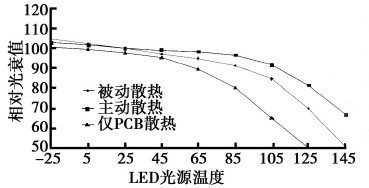 圖4是LED光源溫度與光衰在不同的散熱方式下的關(guān)系曲線。圖中可見僅PCB散熱、加散熱器的被動散熱和強制對流的主動散熱3種不同散熱設(shè)計存在相當大的差異。后二種在105℃時,基本上能夠提供80%以上的出光率。