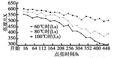 我們對圖3b所示的前大燈樣件做了不同條件下的光衰測試,試驗建立在LED散熱良好的基礎(chǔ)上,模組安裝在大燈封閉殼體內(nèi),溫度檢測點在LED光源附近。試驗數(shù)據(jù)采集時的環(huán)境溫度是在燈體外部施加的。試驗結(jié)果表明環(huán)境溫度60℃時,光衰緩慢;100℃時,光衰加劇(見圖6)。