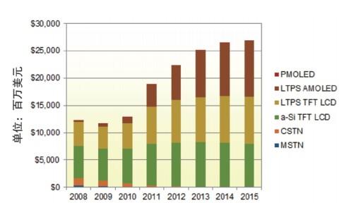 市場調(diào)研公司DisplySearch表示,因新興經(jīng)濟市場繼續(xù)走俏,轉(zhuǎn)向智能手機趨勢增強,技術(shù)要求提高,包括加大顯示屏尺寸、改進分辨率等。預測2011年其顯示屏出貨量將迅速提升到18億片,增長12.5%,銷售額更將大幅增長47%,達到188億美元,2012年續(xù)增19%,達224億美元,預計2015年有望達到約270億美元,2010~2015年的年均增長率為16%,前景可觀(圖l)。