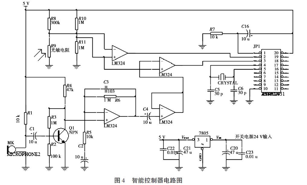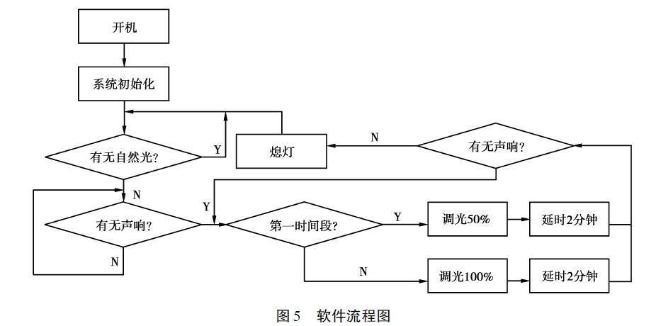 (2)當(dāng)無光(自然光)時,若有人經(jīng)過產(chǎn)生聲響,控制器先判斷時間段,若是在天色完全暗下來時(定義為第一時間段),則使LED發(fā)出100%亮度。其余時間段即天色還較亮,控制器可輸出50%占空比方波,使LED發(fā)出50%亮度即可,這樣可進一步節(jié)省電能,提高用電效率。