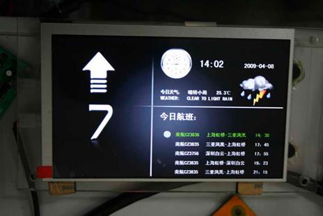 傳統(tǒng)的電梯外呼板采用點(diǎn)陣LED或黑白液晶顯示,顯示效果單調(diào),而采用TFT液晶顯示,不但亮度高,而且可以顯示彩色圖片及文字,顯示效果美觀,此外還可以根據(jù)需要顯示一些廣告、通知等信息,是為未來的發(fā)展方向。