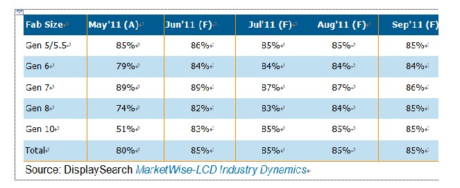 DisplaySearch最新發(fā)布的研究報告指出,由于2011年第三季度市場需求不太明朗,大尺寸TFT LCD面板價格在6月中旬停止上漲。隨著市場需求特別是電視市場需求的減少,面板供應商積極調整以防止面板價格出現(xiàn)大幅波動。面板商原本計劃于第三季度啟動全部產能,使平均利用率達到90%。但根據(jù)DisplaySearch 6月份更新的MarketWise-LCD Industry Dynamics報告顯示,從6月份到9月份TFT LCD面板實際產能利用率將一直維持在85%。