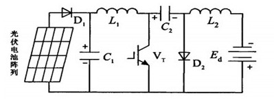 充電控制器作為光伏電池和鉛酸蓄電池的接口電路,一般都希望讓其工作在最大功率點,實現(xiàn)更高的效率,但是在實現(xiàn)最大功率點跟蹤(MPPT)的同時,還需要考慮進行蓄電池充電控制。目前常用的主電路拓撲主要有降壓型電路(Buck)變換器、升壓型電路(Boost)變換器、丘克電路(Cuk)變換器等。一般光伏電池輸出電壓波動較大,而Buck變換器或Boost變換器只能進行降壓或升壓變換,受此影響,光伏電池不能在大范圍內(nèi)完全工作于最大功率點,從而造成系統(tǒng)效率下降。同時,Buck變換器輸入電流紋波較大,如果輸入端不加一個儲能電容就會使系統(tǒng)工作在斷續(xù)狀態(tài)下,從而導致光伏電池輸出電流時斷時續(xù),不能處于最佳工作狀態(tài);而Boost變換器輸出電流紋波較大,用此電流對蓄電池進行充電,不利于蓄電池的使用壽命;Cuk變換器同時具有升壓和降壓功能,將Cuk變換器應用于光伏系統(tǒng)充電控制器中,可以在較大范圍內(nèi)實現(xiàn)最大功率點跟蹤,有利于系統(tǒng)效率的提高。因此,常選用Cuk變換器作為充電控制器的主電路,其系統(tǒng)拓撲如圖7所示。