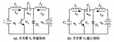 此期間開關管Vr導通,電容C2上的電壓使二極管D2反偏而截止,這時輸入電流iL2使Ll儲能;C2的放電電流iL2使L2儲能,并供電給負載,如圖8(a)所示。
