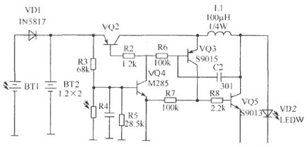 該電路的工作原理:白天有太陽光時,由BT1把光能轉(zhuǎn)換為電能,由VD1對BT2充電,由于有光照,光敏電阻呈低阻,VQ4 b極為低電平而截止。當晚上無光照時光敏電阻呈高阻,VQ4導通,VQ2 b極為低電平也導通,由VQ3、VQ5、C2、R6、L1組成的DC升壓電路工作,LED得電發(fā)光。